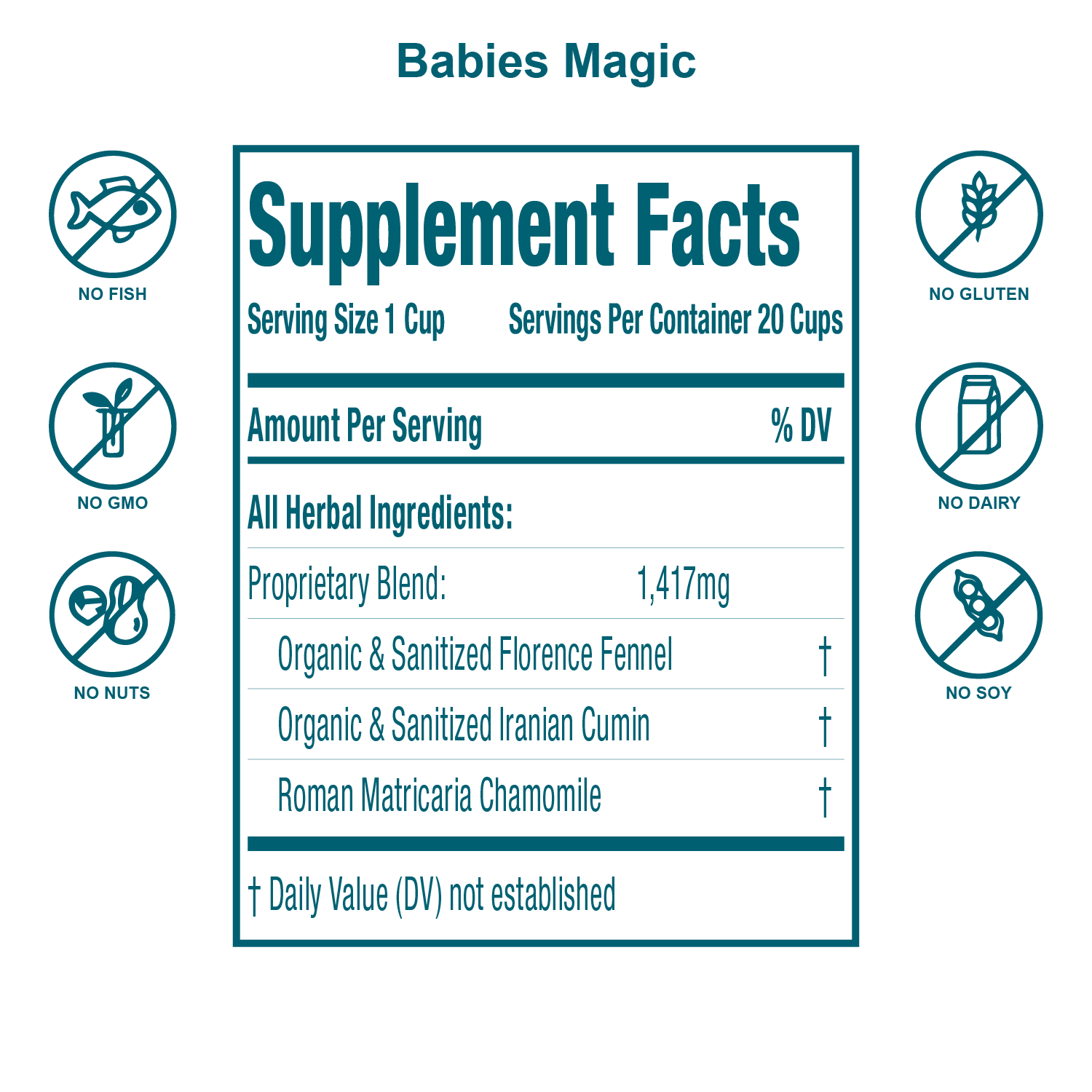 Babies’ Magic Tea is an all natural solution for babies and newborns with typical digestive problems. From colic, gas, constipation, acid reflux, indigestion, and other tummy troubles – it naturally soothes and comforts your child’s belly issues. They’ll sleep better, eat better, and behave better when they’re fully rested. Babies' Magic Tea is Made with organic ingredients. It has NO sugar, No Alcohol, No artificial colors or flavours, No gluten, No dairy, No soy, No chemicals, NO petroleum; 100% vegetarian and vegan